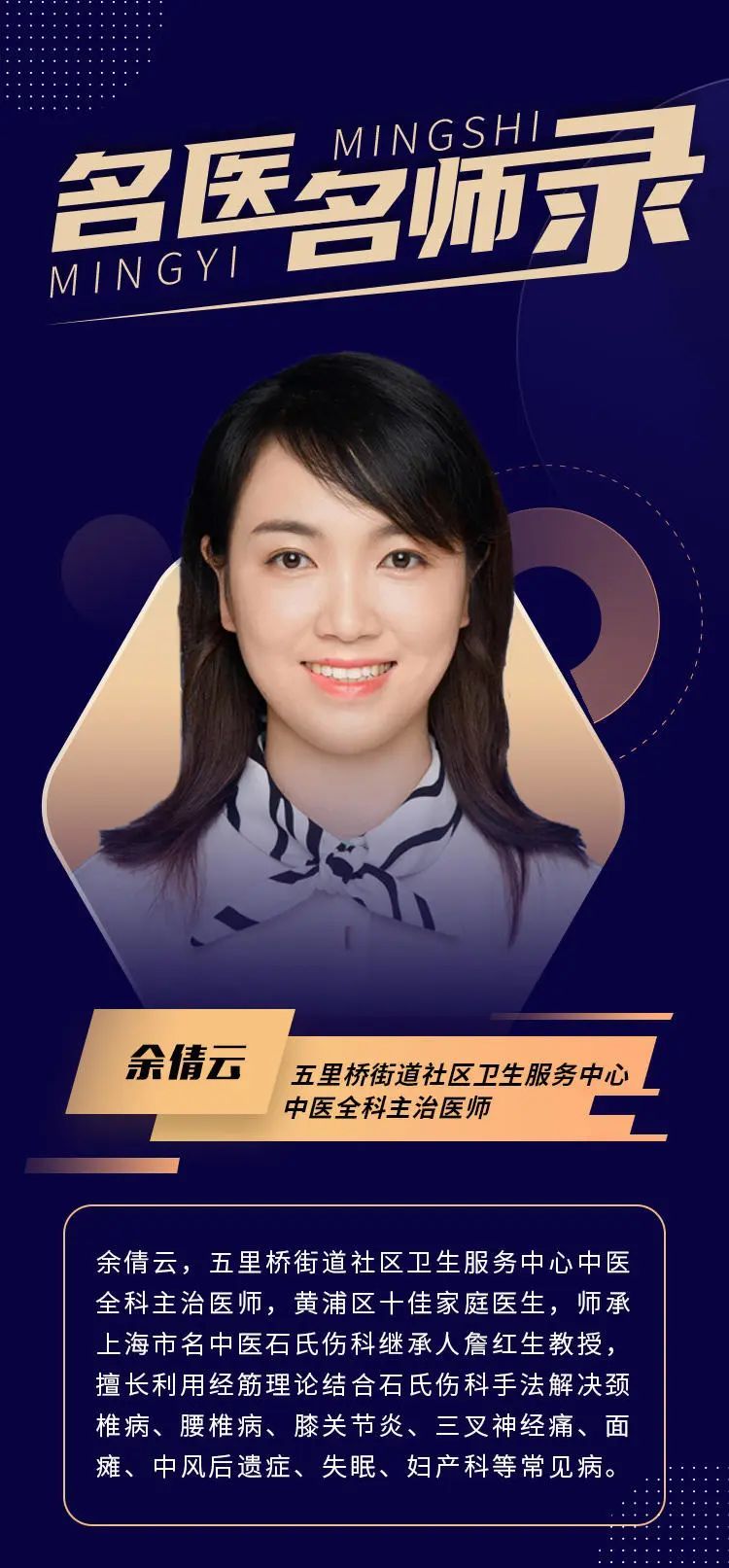 余倩云,五里桥街道社区卫生服务中心中医全科主治医师,黄浦区十佳家庭医生,师承上海市名中医石氏伤科继承人詹红生教授,擅长利用经筋理论结合石氏伤科手法解决颈椎病、腰椎病、膝关节炎、三叉神经痛、面瘫、中风后遗症、失眠、妇产科等常见病。