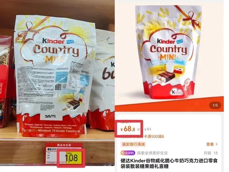420克装的“健达牛奶谷物巧克力”,在福山路121号“百特进口食品折扣店”标价108元,在淘宝上仅68.8元;