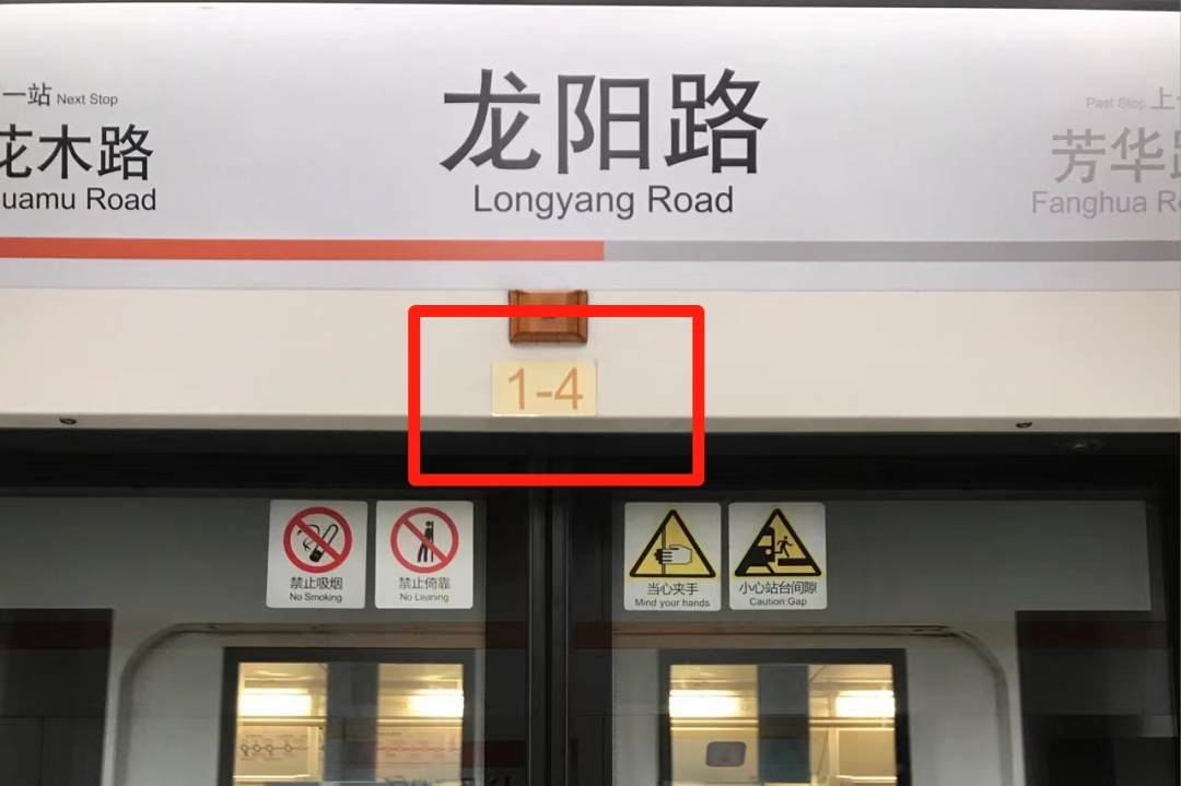 屏蔽门编号位于站台列车停靠时,屏蔽门的正上方或屏蔽门上。此编号具有唯一性,提前告知位置编号,可以在地铁内准确定位。