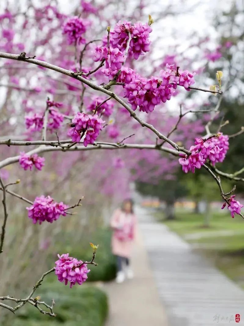 各种早春集中开花的植物,形成了罕见的立体赏花效果:上有粉色垂丝海棠、日本早樱、红运玉兰,下有白色喷雪花等五彩缤纷春花,周边还有延展开去的郁金香、紫荆、郁金香等。