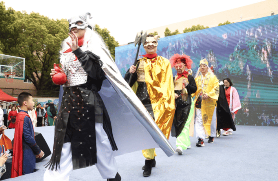 平时衣着端庄、不苟言笑的老师们也纷纷“变身”,拿出自己的绝活,他们扮演起《西游记》《三国演义》《觉醒年代》等各类名著、小说中的角色,外教团队表演了他们为学生专门创作的歌曲,在舞台上与台下学生欢乐互动。
