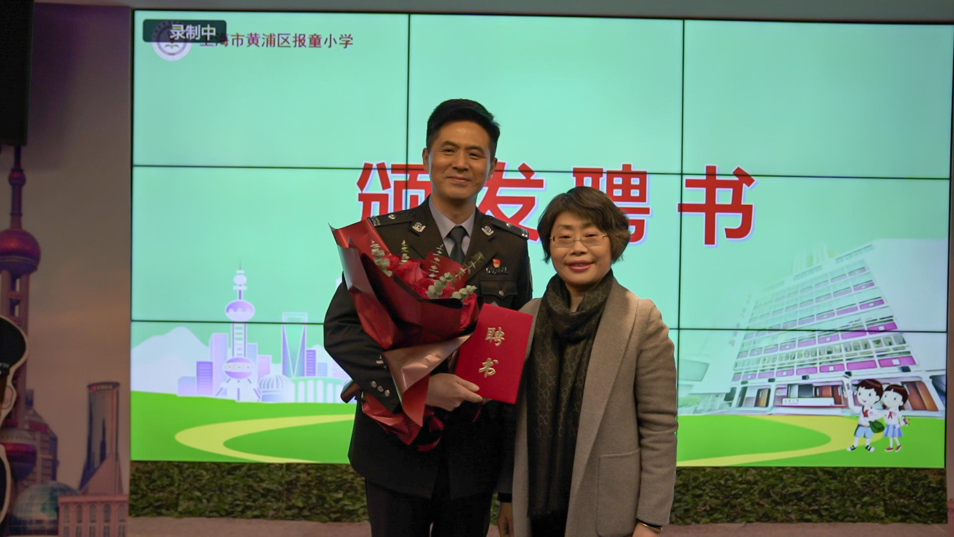 每天有上千万人次通过地铁和公交车的屏幕观看黄奕警官的节目,在潜移默化中提高着安全防范意识。他将“防范”二字深植人心,他还被司法部授予“普法为民好榜样”荣誉称号。他不仅是一名警察,还是我们小朋友最喜爱的“公共安全第一课”的讲师。报童小学荣幸地聘请黄奕警官成为我们学校的安全教育校外辅导员。活动伊始,周琪敏校长代表学校向黄警官颁发了聘书。