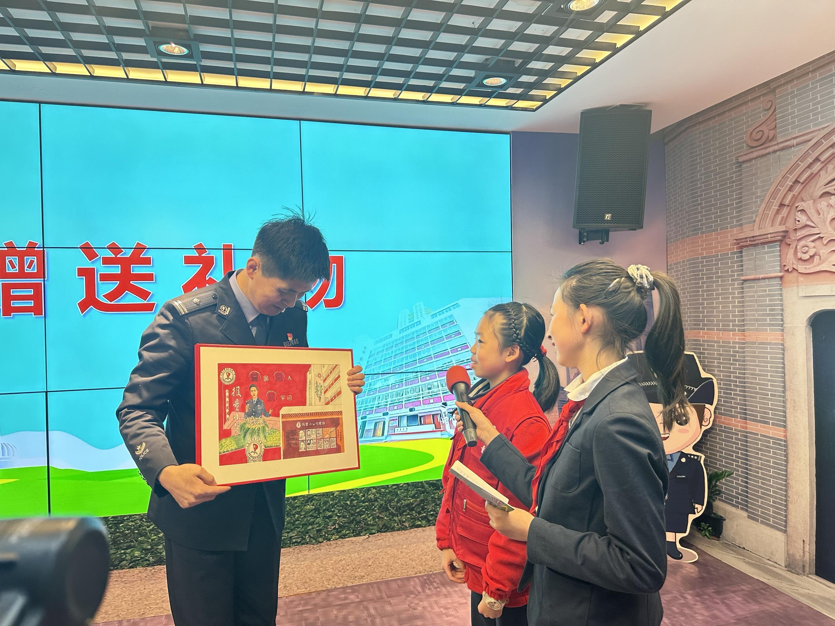 作为2023年全国中小学生安全教育日主题活动,黄奕警官为报报童童带来了“安全”——这个最好的礼物。为了表达我们的感谢,童报社的褚金逸同学代表全校师生献上了亲手绘制的“黄奕警官在报童”的画作以表感谢。