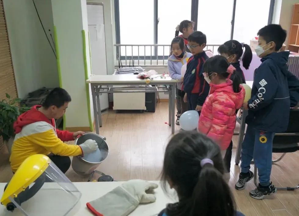 “液氮是低温-196℃的液体,与外界环境有温差时易吸热挥发。当与有温差的物体接触时,可以在不改变细胞结构的情况下快速冷冻物体,没有结晶,但质地脆弱。因为这一特性,在生活中它常常用于运输食物和制作冰品。”来自智勇科创实践基地的老师耐心为大家做出了讲解。