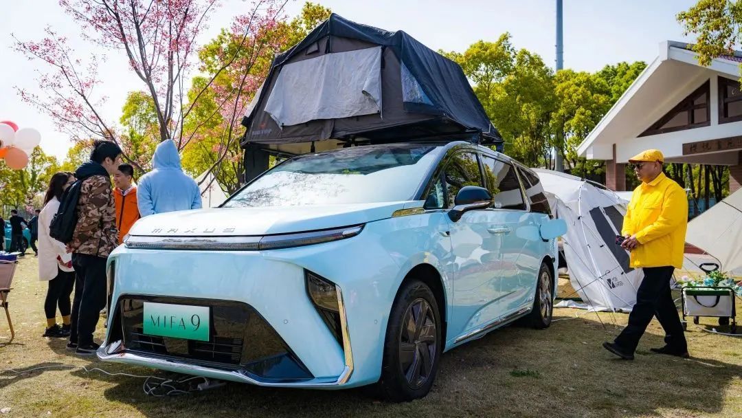 离开展台,可以看到樱花林中停放着一辆大家MIFA9露营版,正依靠V2L(Vehicle to Load)车辆外放电功能,为一旁的露营区供电。用户只需将放电枪插入车辆慢充口插座,通过车载娱乐主机屏或APP设置操作,车辆便能化身6.6kW“超大充电宝”,将车内电量输出给车外电器,为用户解锁更多户外露营新体验。