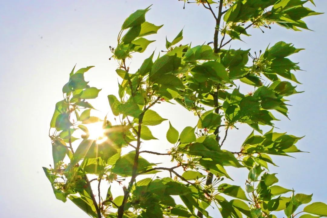 抬头仰望满是嫩叶的枝条