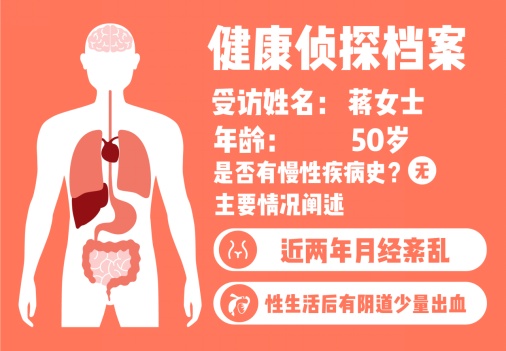 “您的月经情况最近怎样”专职医生继续问道。“以前月经还挺正常的,最近2年有点乱了,有时候2-3个月才来一次,量比以前也少了。”谈及此事,蒋女士一脸苦涩,“人一到更年期,就感觉哪都不舒心。”