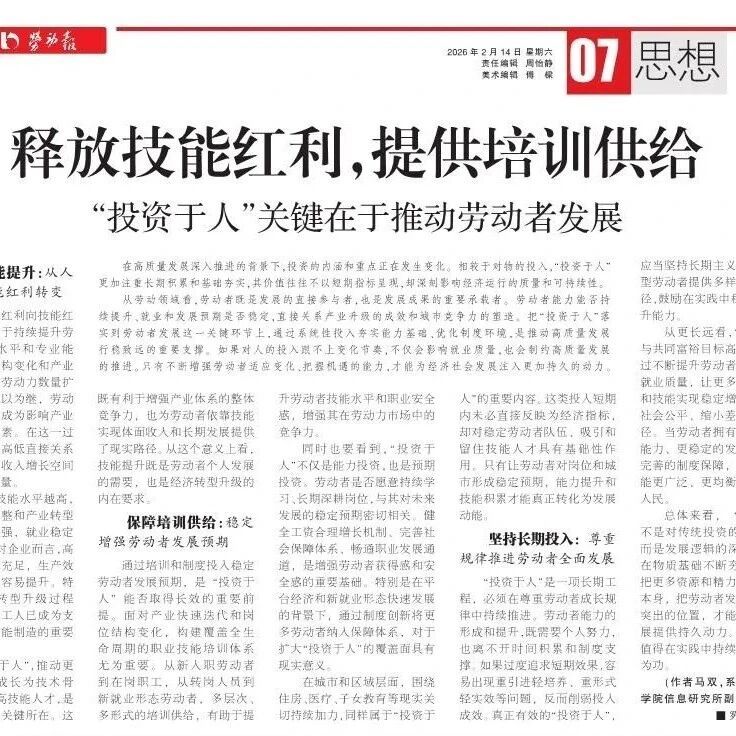 【智库声音】劳动报 | 马双:释放技能红利,提供培训供给 “投资于人”关键在于推动劳动者发展