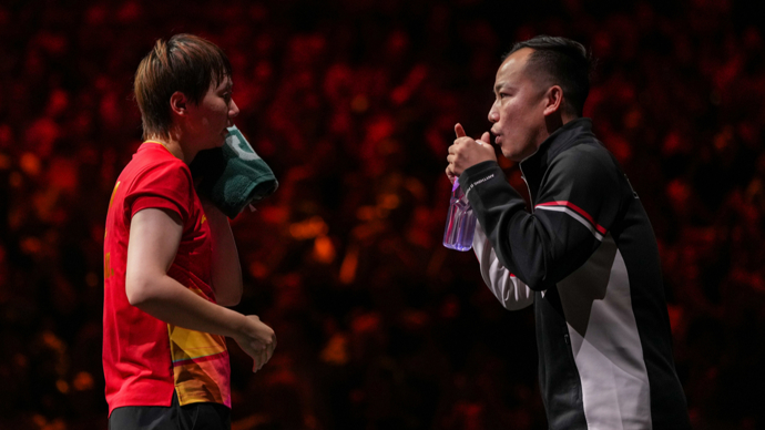 10月2日,王曼昱(左)在比赛中与教练任浩交流。
