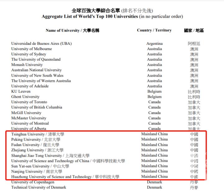 申请人可按此浏览最新的「全球百强大学综合名单」。