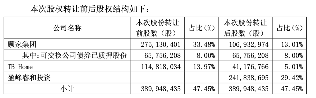 转让完成后,顾江生家族仍持有顾家家居18.02%的股权,为公司二股东,而盈峰睿和投资将成为这家老牌家居企业新的控股股东。