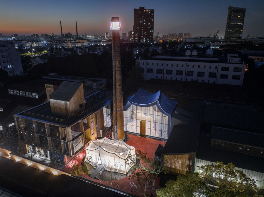 紧接着,俞挺又改造了园区里原航海仪器厂烟囱旁的建筑,其外立面仿如鱼鳞状的蓝色,与相邻建筑的白色形成高低和色调上的对比,取名青丘白崖。