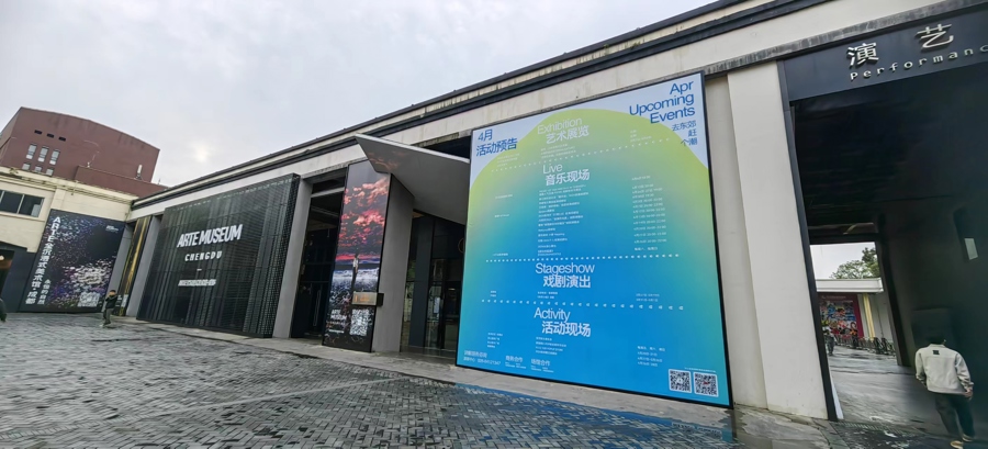 每周更新的文化展演信息,以2层楼高的巨幅海报形式挂在厂房外墙上。