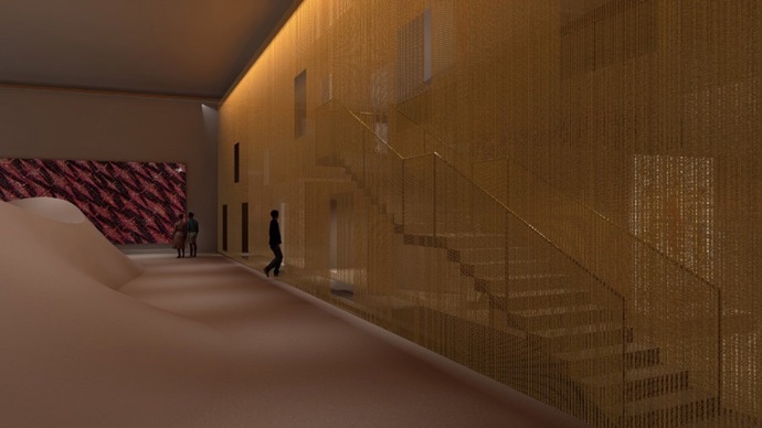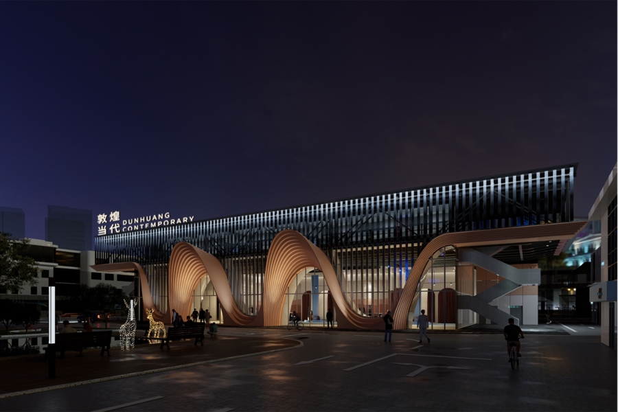 走近敦煌当代美术馆,它的外观如被风吹皱的沙丘,或拱起的石窟,令人想起敦煌的自然景观。外立面以云锦流动的韵律节奏,既呼应敦煌壁画中的美学元素,也为简洁的建筑造型带来丰富的变化。