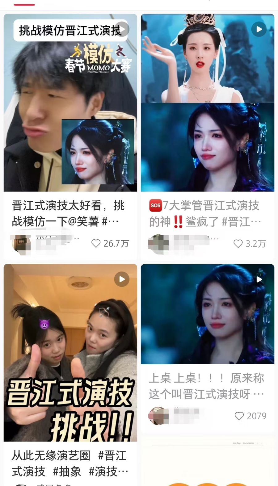 “晋江式演技”一词源于网络小说平台晋江文学城,其小说中常出现“眸光一暗”“三分讥笑四分凉薄”等抽象描述,要求演员通过表演将这些文字具象化,尤其能用眼神戏、微表情传递角色的情感层次。丁禹兮、代露娃、陈都灵、敖瑞鹏、鞠婧祎、赵丽颖等人的表演片段都曾被网友视为“晋江式演技”的代表。但也有网友觉得“晋江式演技”夸张尴尬,还有人对此做二创恶搞,引得很多观众疑惑:“晋江式演技”真的就是好演技吗?