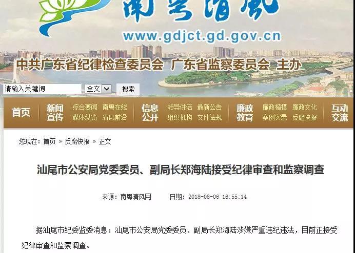 8月6日下午,广东省纪委监委网站发布消息:汕尾市公安局党委委员、副局长郑海陆涉嫌严重违纪违法,目前正接受纪律审查和监察调查。